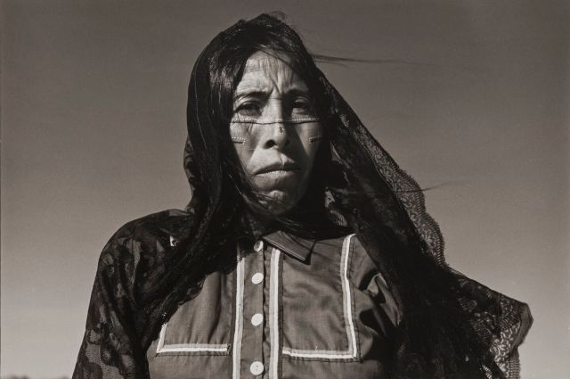 At their own request, the Seri women painted Iturbide’s face as they did their own, a sign of her acceptance into the community. Iturbide did not seek to exoticize or mimic the practice. This self-portrait marks her own self-interrogation and integration with her role as a photographer in the indigenous community.