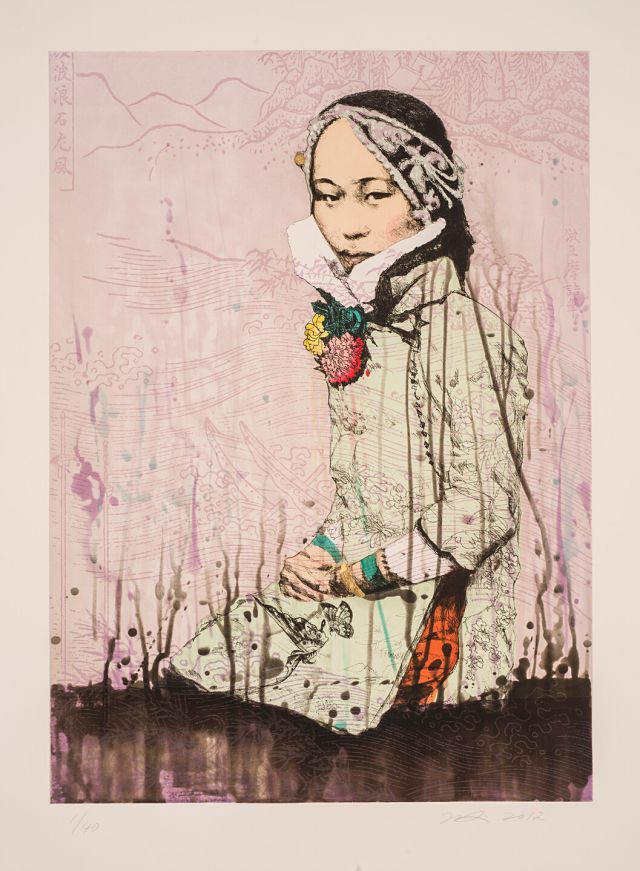 Best known for her highly expressive portrayals of Chinese women, Hung Liu bases a number of her figures on antique photographs of 19th- and 20th-century courtesans. These women appear to be wearing the fashionable qipao, also known as the cheongsam, the long shirt/dress worn by women in the early 20th century and popularized in the 1920s and 1930s in Shanghai.