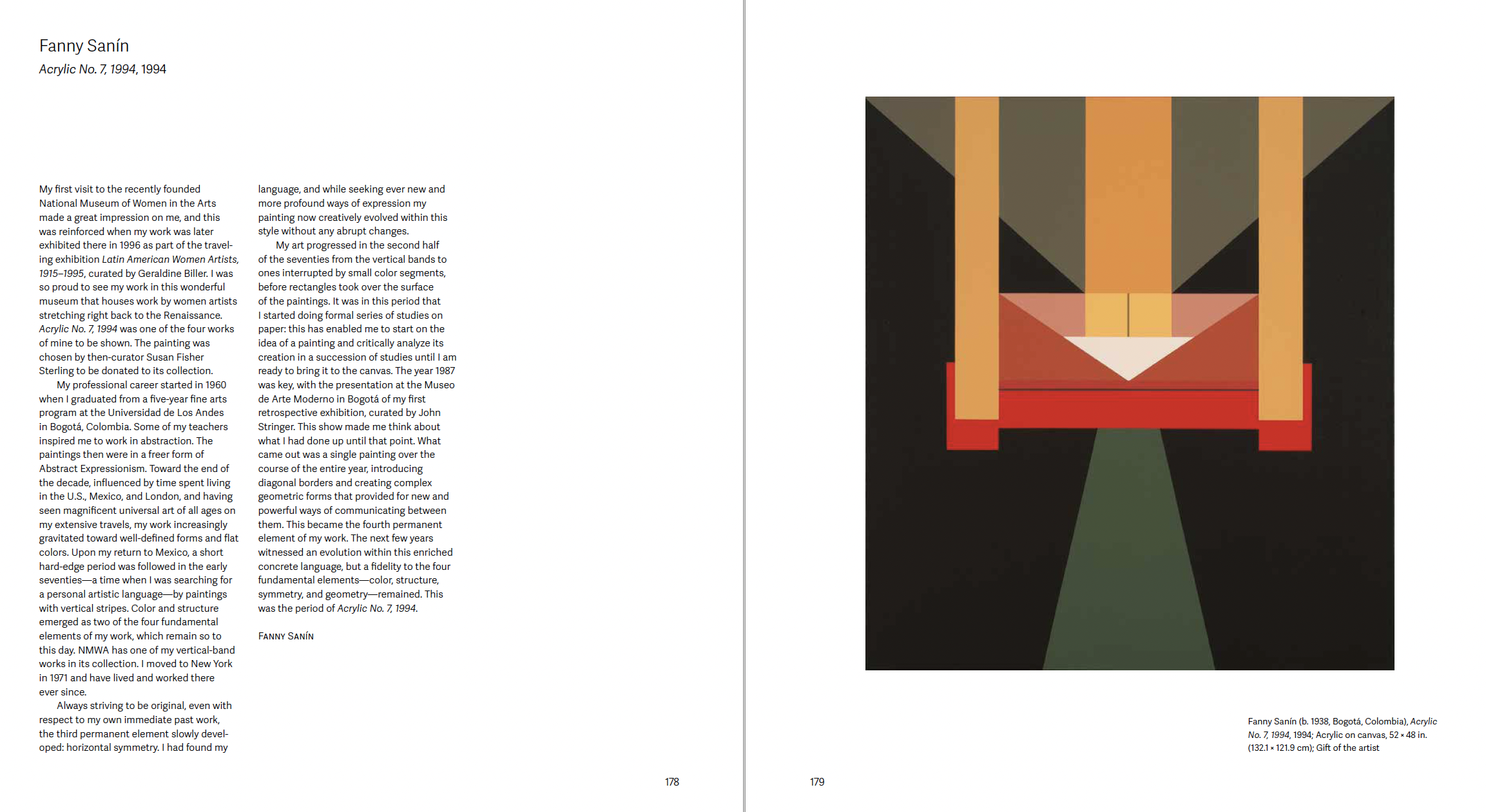 Many artists and essayists told stories of their longtime connections with NMWA, including Fanny Sanín, who wrote about the first time the museum exhibited her abstract painting and the way she developed her signature style; Bridget R. Cooks, who wrote about discovering the art of Alma Woodsey Thomas during a NMWA internship early in her career as an art historian; and the Guerrilla Girls, who wrote about why they included a reference to NMWA in one of their iconic posters.