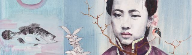 Winter with Cynical Fish is part of a series of four diptych paintings by Liu, each representing one of the four seasons. The artist painted leaves of white bamboo, a plant noted for its ability to withstand harsh winters, over the woman’s body. Because of its hollow stalks, which yield but are difficult to break, bamboo symbolizes strength, tolerance, and integrity. These attributes made bamboo a common motif for scholar-artists in Chinese painting.