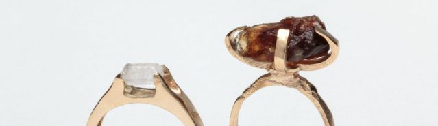 Sugar replaces the traditional diamond in this pair of golden rings. This type of ring often represents a legal union through marriage. Clark uses it to illustrate the binding ties between slavery and goods such as sugar, a major cash crop of the slave trade.