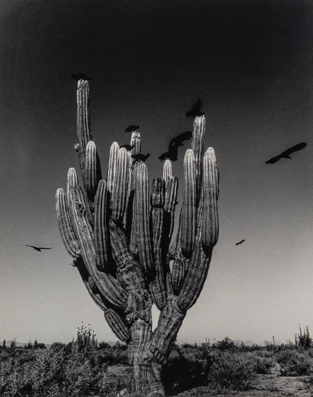 In 1998, Iturbide was invited by Francisco Toledo to photograph the new Ethnobotanical Garden in Oaxaca, one of Mexico’s most biodiverse regions. By design, the garden tells the story of the relationship between the Oaxacan people and their native plants; the founders enlisted local gardeners and healers to facilitate the collection of specimens and to develop protocols for treating plants in need of special care. Iturbide’s portraits of cacti show the plants receiving medical care, with IVs, splints, and other types of treatment. She views those plants, with their unexpected shapes and thorny branches tied with rope or burlap, as sculptures. Some aging and some ailing, they represent suffering and resilience at the same time, their unique forms rich with symbolic meaning.