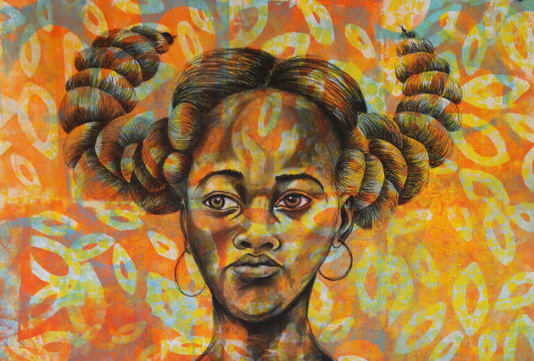 Delita Martin states: “Calling Down The Spirits is an exhibition of portraits that explore ideas of spiritual transition. Throughout the works I have paired portraits with patterns and symbols that show a connection between the waking world and the spirit world. I have used these patterns and symbols to create a visual language that reaches beyond their literal meaning.”