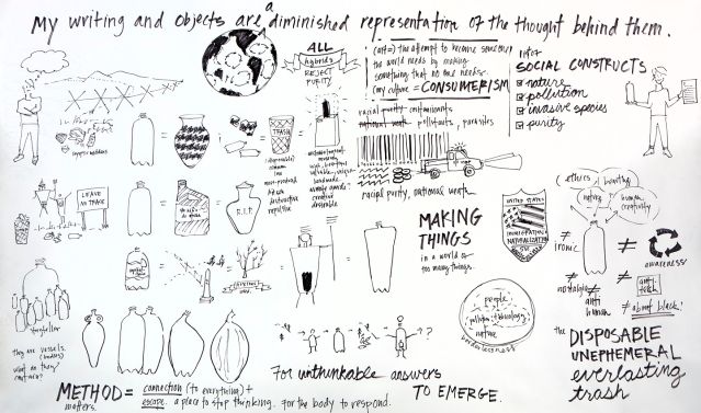 This is a reproduction of a 2014 drawing that Porter Lara made to visualize her thought process as she was envisioning the concept behind the works on display in “Border Crossing.” Presented in it, among other things, are pictograph-like images that draw connections between vessels and people, trash and artifact, as well as what her work ultimately is, and isn’t, about. Explore Porter Lara’s Manifesto more deeply in the next few slides; all quotations taken from her text interMIDDEN.
