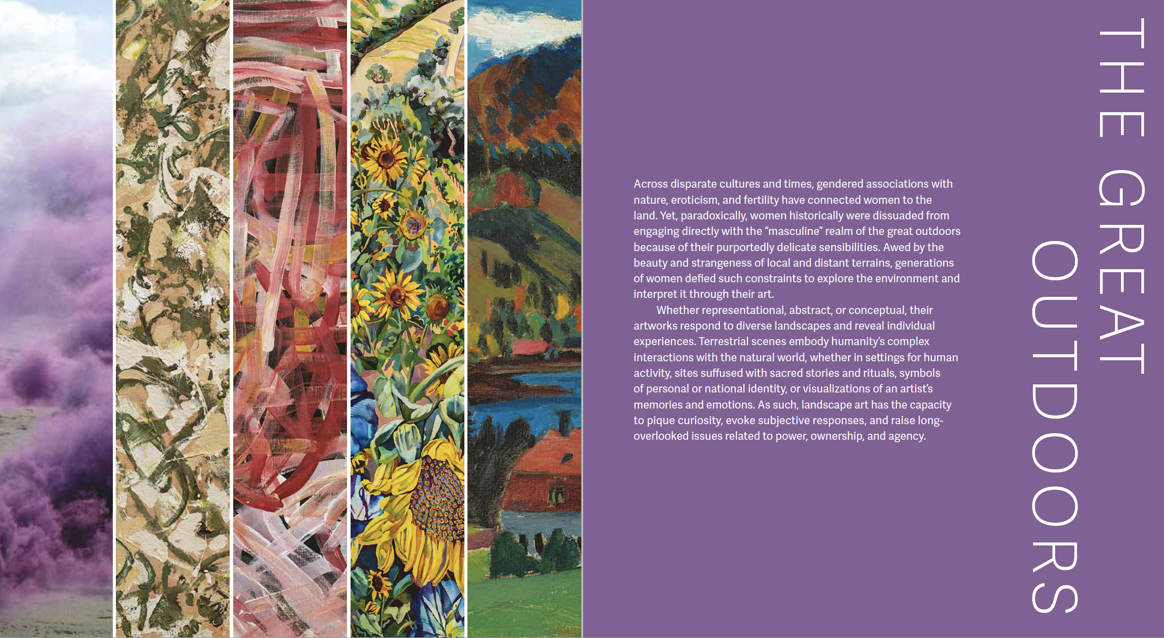 It has a thematic organization that shares certain goals of the thematic organization of our galleries. NMWA’s curators have presented our collection galleries thematically since 2017, with the aim of breaking down exclusionary categories like nationality and time period, instead emphasizing commonalities among women and nonbinary artists across chronology and medium. This leads to a lively presentation that enables visitors to make new discoveries.